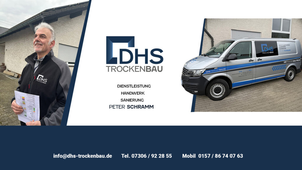Die DHS Trockenbau – Peter Schramm ist ein kleines, familiär geführtes Handwerksunternehmen aus der Region rund um Vöhringen, Senden und Iller. Der Betrieb steht für ehrliche Arbeit, persönliche Zusammenarbeit und zuverlässige Qualität im modernen Trockenbau. Zum Leistungsspektrum zählen unter anderem Akustikbau, Brandschutzmontage, Strahlenschutzbau sowie individuelle Design-Trockenbaulösungen und gewerkeübergreifende